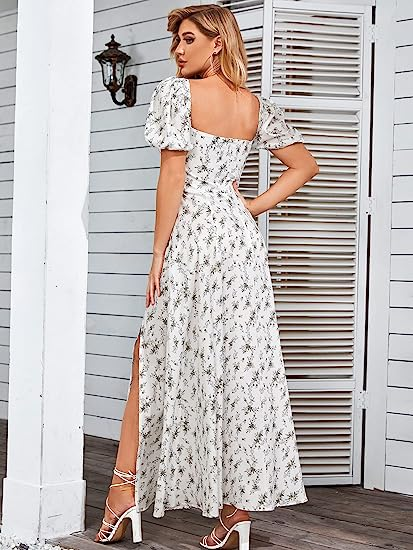 Women's Summer Puff Sleeve Floral Split Maxi Dress Flowy A Line Casual Beach Long Dresses